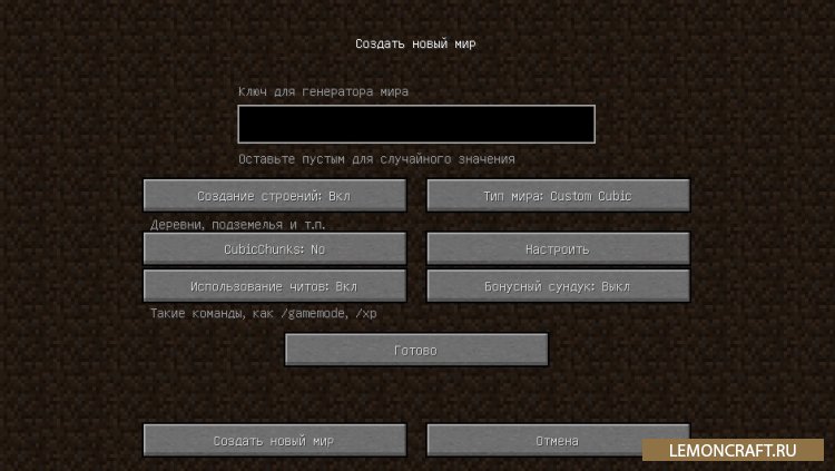 С установкой мода на новую генерацию мира CubicWorldGen у вас появится возможность генерировать миры двумя новыми способами : CustomCubic и FlatCubic. Новые миры будут очень похожи на обычные и суперплоские миры, но есть некоторые изменения. В новых мира нет ограничения по высоте. Кроме этого для настройки генераций существует большое количество новых функций..
